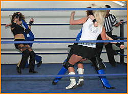 A Tag Match full of fast moves, fancy escapes and, frankly, fun accents. Suicide Blonde is Rain's equal when it comes to in-ring banter and she knows how to get around a ref's warnings too. Sneaky and illegal as they both are, the British ladies are up to the challenge and both teams suffer plenty of upsets in this match as bodies fly and collide almost faster than can be described. Some wicked doubleteaming backfires on one team as they fall victim to their own trickery and the other team's hands are raised in victory!