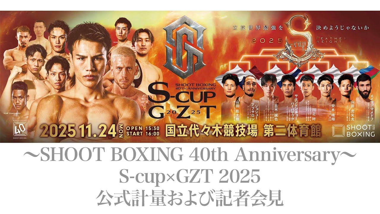 11月23日(日)16時00分より 11月24日(月・祝)『~SHOOT BOXING 40th Anniversary~ S-cup×GZT 2025』の 前日計量及び記者会見をライブ配信いたします。 【11.24.2025『~SHOOT BOXING 40th Anniversary~S-cup×GZT 2025 』in 国立代々木競技場第二体育館概要】 <全対戦カード> ▼S-cup世界フェザー級トーナメント一回戦(1) 58.0kg契約 エキスパートクラスルール 3分3R延長無制限R 山田彪太朗(シーザージム/SB日本フェザー級王者) vs ジョシュー・アブサロン(フランス/ISKA K-1ルール世界スーパーフェザー級王者) ▼S-cup世界フェザー級トーナメント一回戦(2) 58.0kg契約 エキスパートクラスルール 3分3R延長無制限R 古木誠也(REX GYM/KNOCK OUT-BLACKフェザー級王者) vs サタントン・チョーハーパヤック(タイ/プロムエタイ協会スーパーフェザー級王者) ▼S-cup世界フェザー級トーナメント一回戦(3) 58.0kg契約 エキスパートクラスルール 3分3R延長無制限R 安本晴翔(橋本道場/RISEフェザー級王者) vs 川上叶(龍生塾/SB日本フェザー級1位) ▼S-cup世界フェザー級トーナメント一回戦(1) 58.0kg契約 エキスパートクラスルール 3分3R延長無制限R 山田虎矢太(シーザージム/SB日本スーパーバンタム級王者) vs メイマン・マメドフ(アゼルバイジャン) ▼S-cup世界フェザー級トーナメント・リザーブマッチ 58.0kg契約 エキスパートクラスルール 3分3R延長無制限R 魁斗(立志會館/SB日本フェザー級2位、HOOST CUP日本フェザー級王者) vs ソエブ・ベンテビシュ(アルジェリア/AMTFスーパーフェザー級王者) ▼70.0kg契約 エキスパートクラスルール 3分3R延長無制限R 海人(TEAM F.O.D/SB世界スーパーウェルター級王者) vs エンリコ・ケール(ドイツ/元GLORY世界ライト級1位) ▼61.5kg契約 エキスパートクラスルール 3分3R延長無制限R 笠原友希(シーザージム/SB日本スーパーフェザー級王者) vs マンモス・ソー・サラッチープ(タイ/オームノーイスタジアム認定ライト級王者) ▼70.0kg契約 エキスパートクラスルール 3分3R延長無制限R 都木航佑(キャピタルレイズ fighting GlaNz/SB日本スーパーウェルター級王者) vs 憂也(魁塾/RISEミドル級2位) ▼67.5kg契約 MMAルール 5分3R イモト・ボルケーノ(FIGHT SCIENCE/SB日本スーパーライト級王者) vs 芦田崇宏(BRAVE GYM/第8代DEEPフェザー級王者) ▼62.5kg契約 エキスパートクラスルール 3分3R延長無制限R 手塚翔太(Sublime guys・GONG-GYM坂戸/SB日本ライト級3位) vs 健真(BLACK☆Jr/DEEP☆KICK-60kg王者) ▼70.0kg契約 オープンフィンガーグローブマッチ エキスパートクラスルール 3分3R延長無制限R 風間大輝(橋本道場/SB日本スーパーウェルター級1位) vs ネットパヤック サウン・アルハンペクマイ(タイ) 【~SHOOT BOXING 40th Anniversary~S-cup×GZT 2025】 2025年11月24日(月・祝)東京・国立代々木競技場第二体育館 開場/15:30 開始/16:00 主催:株式会社シーザー・インターナショナル 認定:シュートボクシングコミッション 協力病院:俊和会 寺田病院/総合病院厚生中央病院 放送・映像制作:U-NEXT/株式会社NYON/株式会社ブロンコス チケット料金/ VVIP席 100,000円 VIP席 80,000円 SRS席 50,000円 RS席 30,000円 S席 15,000円 スタンドS席 15,000円 スタンドA席 10,000円 スタンドB席 7,000円 ※当日券は各¥500UP UNEXTにて独占生中継!