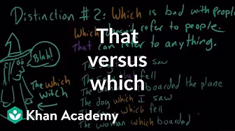 Courses on Khan Academy are always 100% free. Start practicing—and saving your progress—now: Much has been made of the distinction between "that" and "which" in English, but it can mostly be summed up in two points: 1. "That" doesn't work so well with commas. 2. "Which" doesn't work so well with people. David the Grammarian explains. Watch the next lesson: Missed the previous lesson? Grammar on Khan Academy: Grammar is the collection of rules and conventions that make languages go. This section is about Standard American English, but there's something here for everyone. About Khan Academy: Khan Academy offers practice exercises, instructional videos, and a personalized learning dashboard that empower learners to study at their own pace in and outside of the classroom. We tackle math, science, computer programming, history, art history, economics, and more. Our math missions guide learners from kindergarten to calculus using state-of-the-art, adaptive technology that identifies strengths and learning gaps. We've also partnered with institutions like NASA, The Museum of Modern Art, The California Academy of Sciences, and MIT to offer specialized content. For free. For everyone. Forever. #YouCanLearnAnything Subscribe to Khan Academy’s Grammar channel: /频道 Subscribe to Khan Academy: "