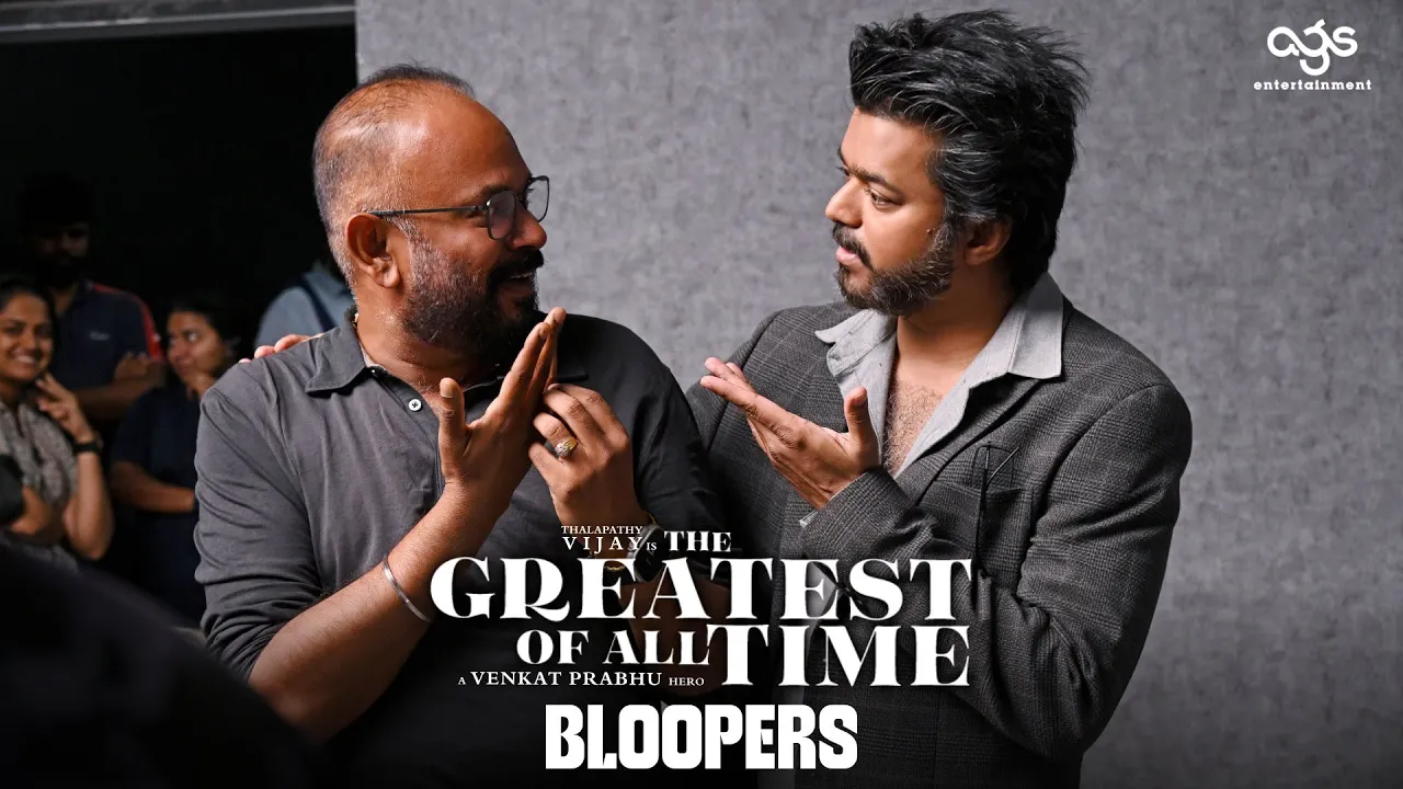 Watch Bloopers from ''The Greatest of All Time'' now ! The GOAT's reign continues stronger than ever and there’s no stopping now 💥 "The Greatest Of All Time". Directed by Venkat Prabhu. Music Composed by Yuvan Shankar Raja. Starring Thalapathy Vijay, Prashanth, Prabhudeva, Mohan, Jayaram, Sneha, Laila, Ajmal Amir, Meenakshi Chaudhary, Parvati Nair, Vaibhav, Yogi Babu, Premgi Amaren, Yugendran Vasudevan and Akilan. Written & Directed by Venkat Prabhu #TheGOAT #ThalapathyVijay #GOATInTamil #VenkatPrabhu #YuvanShankarRaja Film Credits: Music : Yuvan Shankar Raja Banner : AGS Entertainment (P) Ltd Producers : Kalpathi S Aghoram, Kalpathi S Ganesh, Kalpathi S Suresh Creative Producer : Archana Kalpathi Associate Creative Producer : Aishwarya Kalpathi Executive Producer : S.M.Venkat Manickam Director of Photography : Siddhartha Nuni Production Designer : Rajeevan Action : Dilip Subbarayan Editor : Venkat Raajen Dialogue Writers : Viji & Venkat Prabhu Additional Screenplay & Dialogue : K.Chandru & Ezhilarasu Gunasekaran Art Directors : B.Sekar & Surya Rajeevan Costume designers : Vasuki Baskar & Pallavi Singh Sound Mix : T Udayakumar Sound Design : T Udayakumar , Renjith Venugopal, Saravakumar (Sound Vibe) Lyricists : Gangai Amaren, Madhan Karky, Kabilan Vairamuthu, Vivek Choreography : Raju Sundaram, Sekhar VJ, Sathish Stills : D.Maneksha Promo Stills : Sudharsan Publicity Designer : Gopi Prasanna Production Executive : M.Senthikumar, Govindraj & Ramkumar Balasubramanian VFX Head : R.Harihara Suthan DI : B2H Studios Character Designer : Preetisheel Singh D’Souza Direction Team : Kanthan Pitchumani, Saravana Rajan, Veer Ramakrishnan, Thirunavukarasu, Senthil Velayudham, Sasikumar Paramasivan, H.V.Priyan, L.J.Lokie, Prakruthee, Sushmitha Gajendran, Nirmal Chinnayan, Vasanth veeraputhiran ( vv ), Kiruba Robert Cinematography Team : Abhishek Goud, Naveen Sasi, Sreerangam Sravan, Pradeep Thangavel, Vignesh Madheshwaran, Vivekanandan T.V, Pramod Ganta,Vikas Ravi, Yuvan Gimbal Operator - Vivek LR Editing Team : A