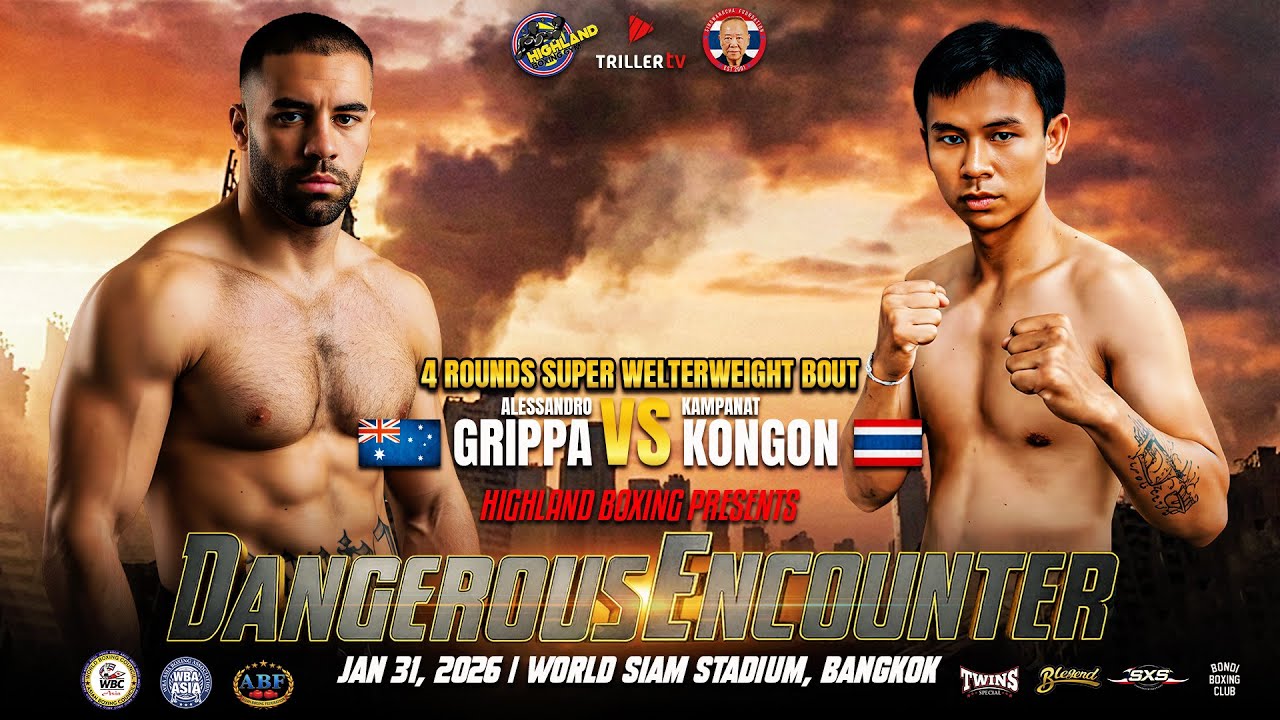 Highland Naris Boxing Promotions presents Dangerous Encounter January 31, 2026 | World Siam Stadium, Bangkok A competitive 4-round super welterweight clash as Alessandro Grippa takes on Kampanat Kongon in an international showdown. Power, skill, and determination will be on full display as both fighters look to control the ring. Expect nonstop action, sharp exchanges, and an exciting fight from the opening bell to the final round. #AlessandroGrippa #KampanatKongon #SuperWelterweight #4Rounds #DangerousEncounter #HighlandNarisBoxing #Boxing #FightNight #BangkokBoxing #WorldSiamStadium #ProBoxing #InternationalBoxing