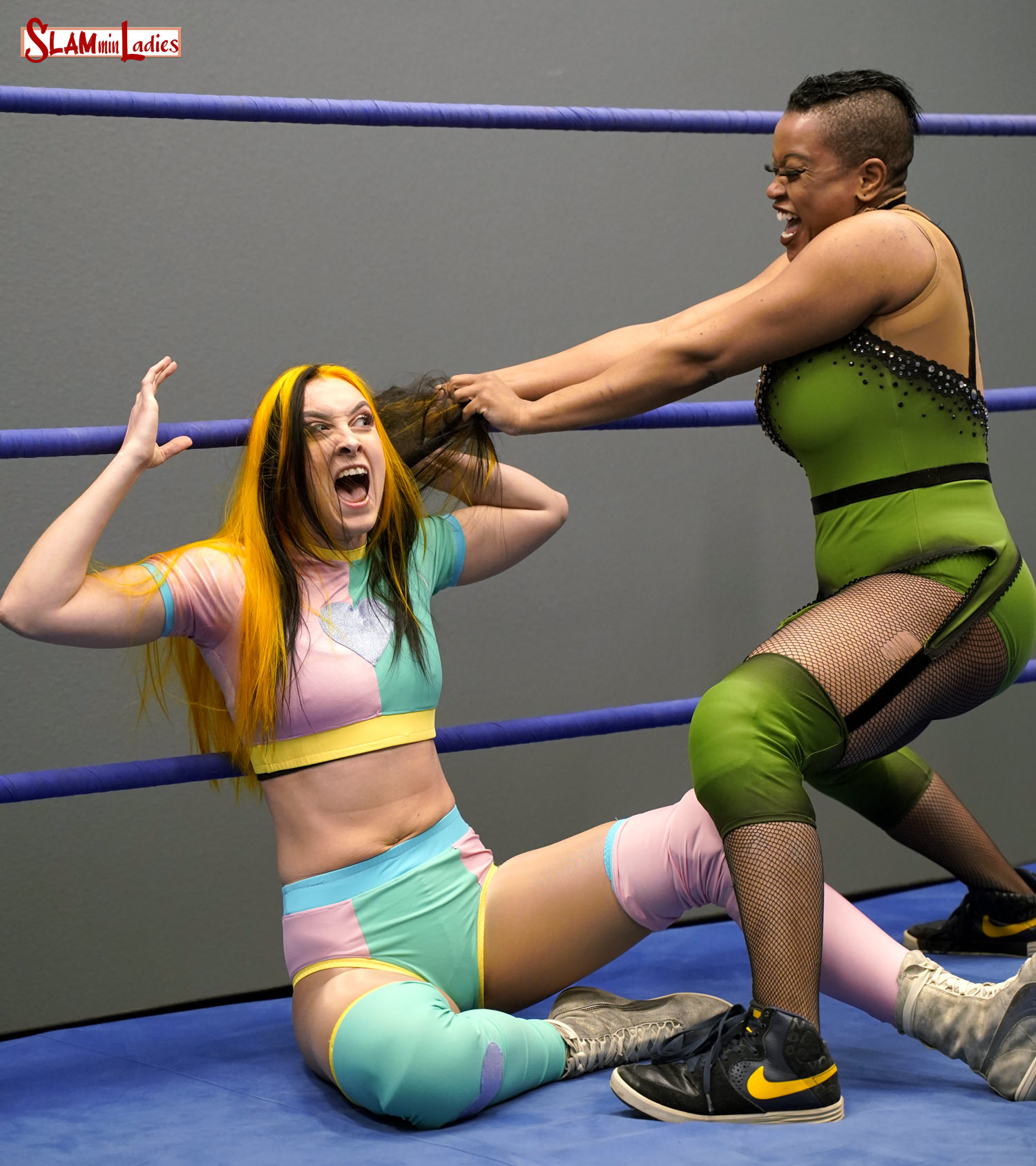 Ava is face down on the canvas checking her scalp for bald spots after being on the losing side in the first round of a hairpulling gauntlet challenge as Vanity ducks through the ropes. It doesn’t get any easier in round two and Ava’s already insisting she didn’t ask for this match even as Vanity drives an elbow into the back of her head and works her over with stomps, kicks and boot chokes. Vanity softens up Ava with shoulderblocks, Bodyslams and a devastating diving Headbutt low blow before tearing into her victim’s follicles with hair chokes, Hairmares and hair stands. Ava manages a desperation jaw breaker but Vanity shrugs it off, leveling Ava with a running Clothesline and hanging her in the turnbuckles for a ‘cookie cutter’ low blow! Vanity destroys poor Ava, draining her with a Camel Clutch while choking her with her own hair before rolling the broken doll over for a pin. After steamrolling to victory, Vanity traps Ava in a tight single leg Boston Crab, pulling on her long hair until she has little choice but to scream her submission! See Part 3 in SLAMpeg 5379!
