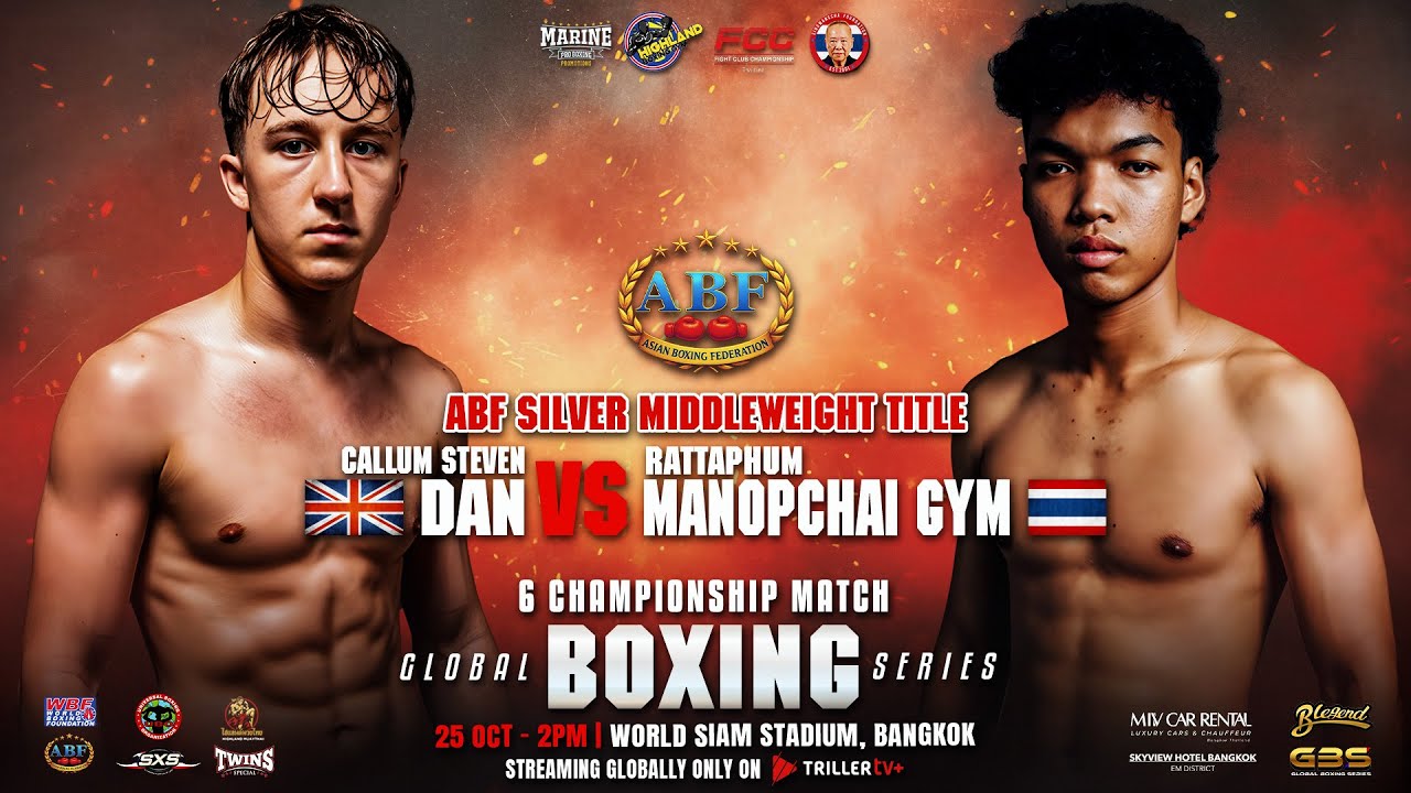 The stage is set for a battle of champions in the making! 💥 🇬🇧 Callum Steven Dan from the United Kingdom collides with 🇹🇭 Rattaphum Manopchai Gym of Thailand for the prestigious ABF Silver Middleweight Title! 🏆 Both warriors bring explosive power, precision, and unbreakable will — expect a war filled with drama, determination, and devastating punches from start to finish! ⚡ 📅 Date: October 25, 2025 📍 Venue: World Siam Stadium, Bangkok, Thailand 🔥 Pride, power, and the Silver crown are all on the line! #Boxing #ABFBoxing #CallumStevenDan #RattaphumManopchaiGym #FightNight #WorldSiamStadium #ABFSilverTitle #Middleweight #BoxingHighlights #UKBoxing #ThailandBoxing #ChampionshipFight #BoxingEvent #KnockoutAction #FightNightBangkok