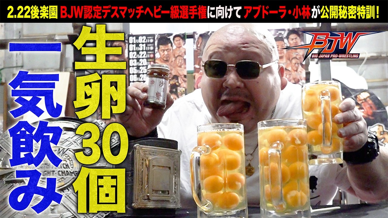 2026年2月5日、大日本プロレス道場にて行われた記者会見後にアブドーラ・小林が生卵30個一気飲みの公開秘密特訓(?)を行いました。 ☆アブドーラ・小林がBJW認定デスマッチヘビー王座をかけて菊田一美とタイトルマッチ!! 後楽園ホールの中心で愛を叫べるか!? 2026年2月22日(日)東京・後楽園ホール大会の情報はこちら→ https://bjw.co.jp/schedule/s2026-02-22/ ※🎦YouTubeメンバーシップで生配信 https://youtube.com/live/jJze2tzD410 【プロフィール PROFILE】 ・アブドーラ・小林 Abdullah Kobayashi https://bjw.co.jp/profile/abdullah-kobayashi/ https://twitter.com/pinpinkoba https://www.instagram.com/ab.kobayashi/ ☆メンバーシップ「BJW CORE YouTube」ご加入で公開中の試合動画が見放題!☆ Subscribe to the membership "BJW CORE YouTube" and watch match videos! →https://www.youtube.com/channel/UC80y-ppI3jcewb8rkOh7oQw/join BJ-SHOP accept orders from overseas! Click here, and you can buy BJW items!→ https://bjw-shop.com/ Twitter English account→ https://twitter.com/BjwEnglish You can watch all BJW videos ,if you subscribe BJWCORE→ http://bjwcore.com/ ☆あなたの街に大日本プロレスが!?大会チケットのご購入はこちらから!!☆ ▼大日本プロレス公式通販サイト「BJ-SHOP」→ https://www.bjw-shop.com ▼チケットぴあ→ https://w.pia.jp/t/bjw/ ▼イープラス→ https://eplus.jp/bjw/ ▼ローソンチケット→ https://l-tike.com/sports/bjw/ ☆大日本プロレス公式サービス一覧☆ ▼月額888円で大日本プロレスが見放題!「BJW CORE 」→ http://bjwcore.com/ ▼大日本プロレス公式HP→ http://www.bjw.co.jp ▼大日本プロレス公式Twitter→ https://twitter.com/BJWOfficial ▼大日本プロレス公式Instagram→ https://www.instagram.com/bjw_official/ ▼大日本プロレス公式TikTok→ https://www.tiktok.com/@bjw_official ▼"その効果反則級!!!"「販促レスラー」→ https://www.hansokuwrestler.com/ ▼ニコニコ生放送「大日本プロレスch」 → https://ch.nicovideo.jp/bjw #プロレス #大日本プロレス #BJW #prowrestling #アブドーラ小林