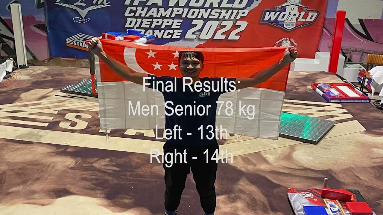 I just got back from the 2022 IFA World Championships in Dieppe, France. Boy was it an eye-opening and exciting experience. I eventually took 13th and 14th place in the Senior Men 78 kg classes for left and right hand respectively. This was the toughest and biggest tournament I've ever been to, and it only makes me hungrier for more competition! Can't wait for the next one. FULL RESULTS: SENIOR MEN LEFT 78 KG 1. ARTUR KRUPA (POLAND) 2. JOHANNES ANDERSSON (SWEDEN) 3. CRAIG SANDERS (UNITED KINGDOM) 4. ROBERT RODIN (SWEDEN) 5. VOLODYMYR PARII (UKRAINE) 6. COREY MILLER (UNITED STATES) 7. AKU MOKSI (FINLAND) 8. TERO LOUKOLA (FINLAND) 9. BEN BLEDSOE (UNITED STATES) 10. CONNOR SALE (UNITED KINGDOM) 11. JOSHUA HANDELAND (UNITED STATES) 12. SZYMON BUGAJSKI (POLAND) 13. YI CHEN GREGORY YEO (SINGAPORE) 14. NIELSEN MIKKEL (DENMARK) 15. ARMEN ARUTINIAN (GEORGIA) 16. ANIL NAJRAN (UNITED KINGDOM) 17. DARIUSZ GROCH (POLAND) 18. PIRUZ TCHELIDZE (GEORGIA) 19. MARKO MEIJANEN (FINLAND) 20. DAVID GIBSON (UNITED KINGDOM) 21. MARIUS ANDERSEN (DENMARK) 22. MASON DROESSE (CANADA) 23. LIAM BERGSTROM (SWEDEN) 24. ERIN VARGHIS KONDOOR (INDIA) ---------------------------------------------------------------------------- SENIOR MEN RIGHT 78 KG 1. ARTUR KRUPA (POLAND) 2. DIMITRIS FILIKIDIS (GREECE) 3. COREY MILLER (UNITED STATES) 4. JOHANNES ANDERSSON (SWEDEN) 5. MASON DROESSE (CANADA) 6. ROBERT RODIN (SWEDEN) 7. ANIL NAJRAN (UNITED KINGDOM) 8. PIRUZ TCHELIDZE (GEORGIA) 9. ARMEN ARUTINIAN (GEORGIA) 10. CONNOR SALE (UNITED KINGDOM) 11. DARIUSZ GROCH (POLAND) 12. VOLODYMYR PARII (UKRAINE) 13. MARKO MEIJANEN (FINLAND) 14. YI CHEN GREGORY YEO (SINGAPORE) 15. ERIN VARGHIS KONDOOR (INDIA) 16. MARIUS ANDERSEN (DENMARK) 17. CRAIG SANDERS (UNITED KINGDOM) 18. AKU MOKSI (FINLAND) 19. MARCIN STRUŚ (POLAND) 20. NIELSEN MIKKEL (DENMARK) 21. DAVID GIBSON (UNITED KINGDOM) 22. JOSHUA HANDELAND (UNITED STATES) #armwrestling #singaporearmwrestling #IFA