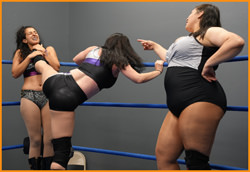 Miss Rachel referees a Sleeperhold Title match between Sophia and Jayme (the reigning champion.) Jameson doesn’t suffer from a lack of confidence as she proclaims herself Queen of the Universe during intros, but Sophia is a veteran who’s not intimidated by boasting. The opening lockup sees the pair spar through Headlocks, Wristlocks, and Hammerlocks before Jayme takes Castillo down with a shoulderblock and locks in a Sleeper! It’s early going and just a taste of the treatment she’s got in store for Sophia. Jayme bashes Sophia with hard corner whips, hair-slams and Clotheslines. She stretches Sophia in a standing Full Nelson, throttles her with a boot choke and staggers her with forearms to the throat. Jameson teases Sophia, applying Sleepers only to let her prey free for more punishment. Finally, Jayme wraps her arms around Sophia's head, draining the fight from her limbs for the win. Jameson wakes Sophia up in a surprise act of kindness, but Castillo instinctively lashes out to continue the fight until Jayme stops her quick with a knee to the gut. Another Jameson beat down and a final Sleeper leaves Sophia KOed on the canvas.