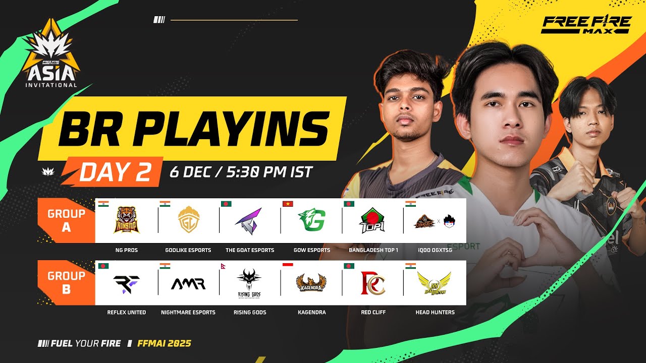 🔥 The Wait Is Over! FFMAI 2025 BR Play-Ins Day 1 is HERE! 🔥 After months of anticipation, the moment has finally arrived! The Free Fire MAX Asia Invitational 2025 kicks off today with the Battle Royale Play-Ins! This is where the road to the Main Event begins: 18 invited teams have entered the Play-Ins, but only the Top 10 will survive to advance and join the 8 Seeded Teams in the Main Event. The competition is cutthroat—every point matters, and there is no room for error. Today, Group B faces off against Group C. These squads are fighting not just for a Booyah, but for their survival in the tournament. Playing Today: Group B: Reflex United, Nightmare Esports, Rising Gods, Kagendra, Red Cliff, Head Hunters. Group C: Avida x KDC, GB Esports, Meta Ninza, Revenant Xspark, Fangs, iQOO Reckoning. The cheers will roar, the pressure is real, and the race for the Top 10 starts today. 18 Teams. 10 Qualifying Spots. The fight for survival begins NOW! 👑 Fuel Your Fire! 🔥 📺 Watch LIVE: Time: Starting at 5:30 PM IST #FuelYourFire #FFMAI #FFM #FFMEsports