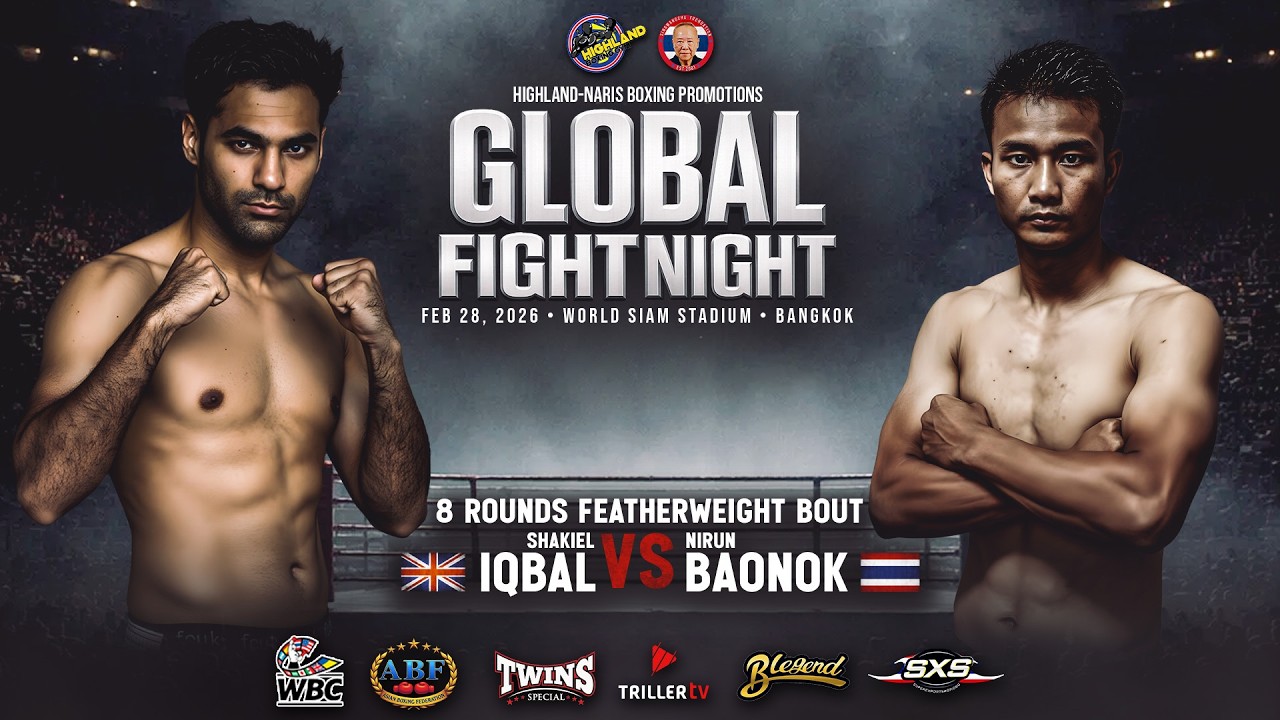 GLOBAL FIGHT NIGHT Feb 28, 2026 World Siam Stadium – Bangkok, Thailand Highland Boxing Promotions Presents 🇬🇧 Shakiel Iqbal vs 🇹🇭 Nirun Baonok 8 Rounds | Featherweight Bout England clashes with Thailand in a thrilling featherweight contest. Fast combinations. Relentless aggression. Every round packed with action. Eight rounds. Non-stop intensity. #GlobalFightNight #HighlandBoxingPromotions #Featherweight #EnglandVsThailand #BangkokThailand #FightNight #Boxing2026