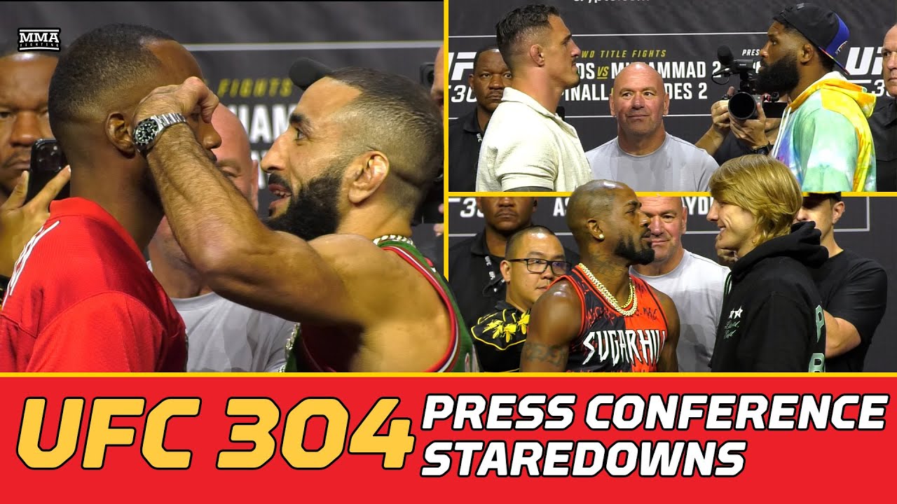 Watch the #UFC304 press conference faceoffs, which include #UFC welterweight champion Leon Edwrds and Belal Muhammad trading taunts, plus interim heavyweight champion Tom Aspinall and Curtis Blaydes, and King Green and Paddy Pimblett. Join this channel to get access to perks: https://www.youtube.com/channel/UC4f1JueVgo5t9HSmobCRPug/join Subscribe to MMA Fighting on YouTube: http://goo.gl/dYpsgH Subscribe to The MMA Hour on iTunes: http://Apple.co/themmahour Subscribe to The MMA Hour on Spotify: https://open.spotify.com/show/0NUQhyUeYQcbtHOV10qmbb Subscribe to MMA Fighting feed on iTunes: https://podcasts.apple.com/us/podcast/mma-fighting/id320642139 Check out our full video catalog: http://goo.gl/u8VvLi Visit our playlists: http://goo.gl/eFhsvM Like MMAF on Facebook: http://goo.gl/uhdg7Z Follow on Twitter: http://goo.gl/nOATUI Read More: http://www.mmafighting.com MMA Fighting is your home for exclusive interviews, live shows, and more for one of the world's fastest-growing sports. Get latest news and more here: http://www.mmafighting.com