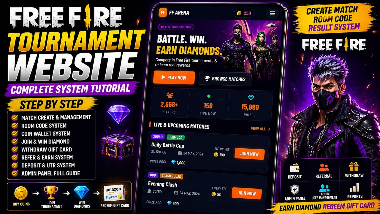 Free Fire Tournament Website Kaise Banaye ๐ฅ Full System (Coins, Matches, Rewards)