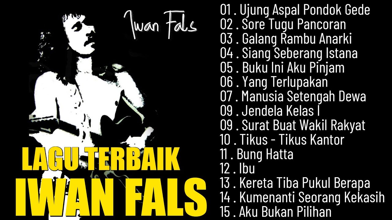 IWAN FALS FULL ALBUM TERBAIK TERPOPULER SEPANJANG MASA ꧁༺Tracklist༻꧂ [00:00:00] - 01 . Ujung Aspal Pondok Gede [00:05:08] - 02 . Sore Tugu Pancoran [00:09:17] - 03 . Galang Rambu Anarki [00:13:10] - 04 . Siang Seberang Istana [00:19:11] - 05 . Buku Ini Aku Pinjam [00:23:58] - 06 . Yang Terlupakan [00:28:54] - 07 . Manusia Setengah Dewa [00:33:11] - 09 . Jendela Kelas I [00:36:46] - 09 . Surat Buat Wakil Rakyat [00:43:18] - 10 . Tikus - Tikus Kantor [00:45:51] - 11 . Bung Hatta [00:49:53] - 12 . Ibu [00:52:46] - 13 . Kereta Tiba Pukul Berapa [00:56:53] - 14 . Kumenanti Seorang Kekasih [01:00:14] - 15 . Aku Bukan Pilihan Tahun 1981 menjadi tahun terobosan Iwan Fals ketika ia menandatangani kontrak dengan Musica Studio untuk merekam album solo pertamanya, Sarjana Muda. Album ini menampilkan gaya musik country khas Iwan Fals, dengan lagu protes Guru Oemar Bakrie, tentang menjadi guru bergaji rendah namun tetap mempunyai tanggung jawab mendidik orang-orang sukses dan bergaji tinggi. Guru Oemar Bakrie menjadi sangat tenar dan tenar di Indonesia, serta ikut mengharumkan nama Iwan. [4] Album ini juga berisi beberapa balada. Album ini mendapat keuntungan dari investasi signifikan yang dilakukan Musica Studio, yang menggunakan musisi dan produser berkualitas tinggi untuk album tersebut. Opini tahun 1982, juga di Musica Studio, mengokohkan reputasi Iwan sebagai penyanyi protes sekaligus pemain balada. 'Galang Rambu Anarki', yang dipersembahkan untuk putranya yang baru lahir, memadukan kedua elemen tersebut, mengomentari momen bahagia kelahiran anak pertamanya, namun juga kenaikan harga, mengatakan bahwa anaknya mungkin akan kekurangan gizi jika tidak bisa. mampu membelinya. membeli susu. Tahun 1983 dirilisnya Sumbang, sedangkan album yang dirilis pada tahun 1984 adalah Barang Antik dan SUGALI. Pada bulan April 1984, Iwan ditangkap dan diinterogasi selama dua minggu setelah membawakan lagu Demokrasi Nasi dan Mbak Tini, kedua lagu tersebut tidak pernah direkam dalam album, di Pekanbar