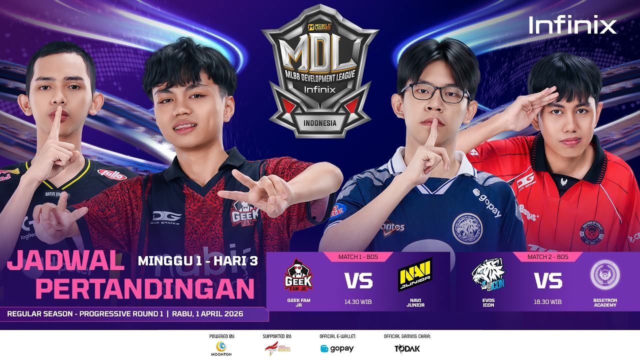 "Jadwal Harian Minggu 1 Hari 3! ๐ฅ Hari ketiga INFINIX MDL ID S13 segera dimulai. Empat tim akan kembali bermain untuk memperebutkan kemenangan guna membawa mereka ke posisi yang aman di round selanjutnya! GEEK FAM JR VS NAVI JUNIOR Geek Fam Jr datang dengan misi bangkit setelah musim lalu harus gagal melaju ke babak playoffs akibat performa yang belum konsisten. Di sisi lain, NAVI Junior tampil impresif dengan berhasil menembus semifinal dan menutup musim di posisi tiga, menunjukkan kapasitas mereka sebagai salah satu tim terkuat di MDL season ini. Akankah Geek Fam Jr mampu membalikkan keadaan, atau justru NAVI Junior kembali melanjutkan performa solid mereka? EVOS ICON VS BIGETRON ACADEMY Musim sebelumnya, Sang Macan Putih sempat tampil sempurna di fase group stage, namun harus terhenti sebelum babak playoffs. Berbanding terbalik, Sang Robot Merah justru melaju tanpa kekalahan hingga mengamankan gelar juara. Pertemuan ini juga membawa sejarah panjang, di mana kedua tim pernah saling mengalahkan di panggung MDL ID, termasuk saat Bigetron Academy menumbangkan EVOS di partai final. Akankah Sang Macan Putih mampu bangkit dan membalas dominasi, atau justru Sang Robot Merah kembali menunjukkan kelas mereka sebagai juara bertahan? Ayo dukung tim dan player favoritmu yang akan bertanding hari ini! Nonton Langsung INFINIX MDL ID S13 di : ๐บ YouTube: MDL Indonesia ๐บ Facebook: MDL Indonesia ๐บ TikTok : MDL Indonesia #MDLIDS13 #MDLIndonesia #Esports4Everyone"