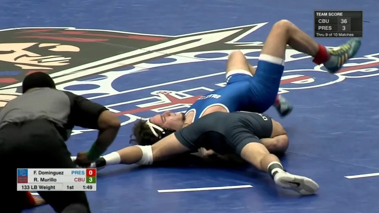 2025/26 Presbyterian vs Cal Baptist wrestling dual 133lbs Remy Murillo (CBU) fall Fernando Dominguez (PRES) I do not own this video, all credit/rights to ESPN/SoCon