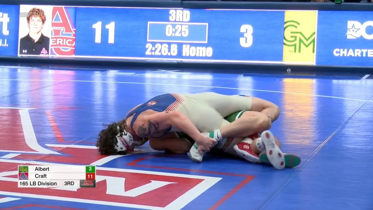 2025/26 American vs George Mason wrestling dual 165lbs Austin Craft (AU) maj dec Jackson Albert (GMU) I do not own this video, all credit/rights to ESPN/EIWA