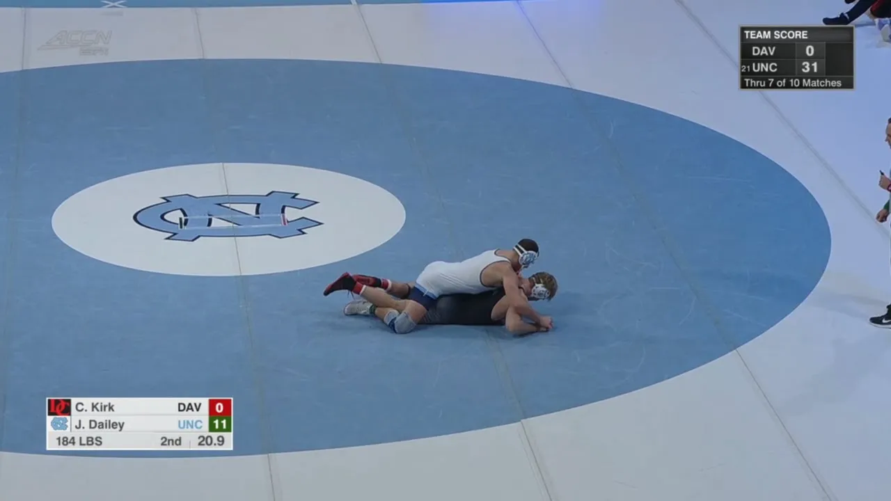 2025/26 North Carolina vs Davidson wrestling dual 184lbs Jake Dailey (UNC) tech fall Cody Kirk (DC) I do not own this video, all credit/rights to ESPN/ACC