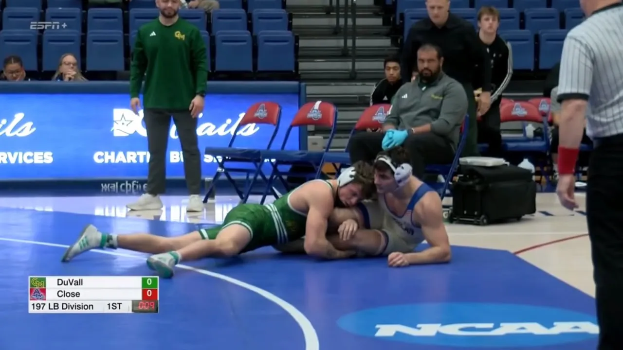 2025/26 American vs George Mason wrestling dual 197lbs #21 Malachi Duvall (GMU) maj dec Caleb Close (AU) I do not own this video, all credit/rights to ESPN/EIWA