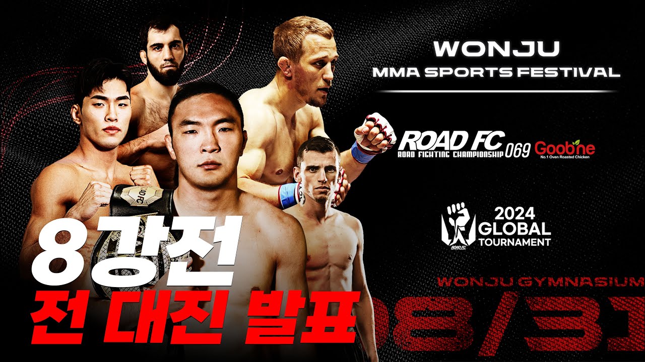 2024 GLOBAL TOURTNAMENT QUARTER FINALS FIGHT CARD ANNOUNCEMENT [WONJU MMA SPORTS FESTIVAL] 원주 MMA스포츠 페스티벌-굽네 ROAD FC 069 / 8월 31일 오후 2시 원주 종합체육관] [라이트급 토너먼트 8강전 박시원 VS 데바나 슈타로] [라이트급 토너먼트 8강전 박해진 VS 아르투르 솔로비예프] [라이트급 토너먼트 8강전 난딘에르덴 (김인성) VS 알렉스 다 실바] [밴텀급 토너먼트 8강전 양지용 VS 알렉세이 인덴코] [라이트급 토너먼트 8강전 한상권 VS 카밀 마고메도프] [밴텀급 토너먼트 8강전 하라구치 아키라 VS 으르스켈디 두이셰예프] [밴텀급 토너먼트 8강전 김현우 VS 루카스 페레이라] [미들급 윤태영 VS 임동환] ▶ 굽네치킨 : https://www.goobne.co.kr/ ▶ 굽네몰 : https://www.goobnemall.com/ ▶ ROAD FC 공식 홈페이지 : http://www.roadfc.com/ ▶ ROAD FC AfreecaTV : http://bj.afreecatv.com/roadfc999 ▶ ROAD FC 페이스북 : https://www.facebook.com/roadfc/ ▶ ROAD FC 인스타그램 : https://www.instagram.com/roadfc/ ▶ 로드FC 용품 스토어 로드프렌즈 : https://roadfcstore.com/