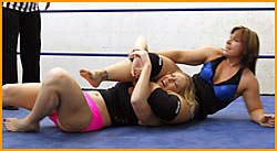 Special guest referee Josie. Both wrestlers barefoot from the outset, we open with them stretching in preparation for their bout. Some barbs are traded, there's a shoving match and suddenly the match is on! The action quickly moves to the outside and one grappler finds her toes under attack! The fighters are out for blood as they use every trick fair and foul trying for the win. In and out of the ring, in the ropes, bringing a chair into play, Bronco Buster, low blow, hung upside down in the corner--the ref is next to useless at keeping order. Knockout move to finish this one-but it goes into extra innings with some in the ropes humiliation--by both ladies!