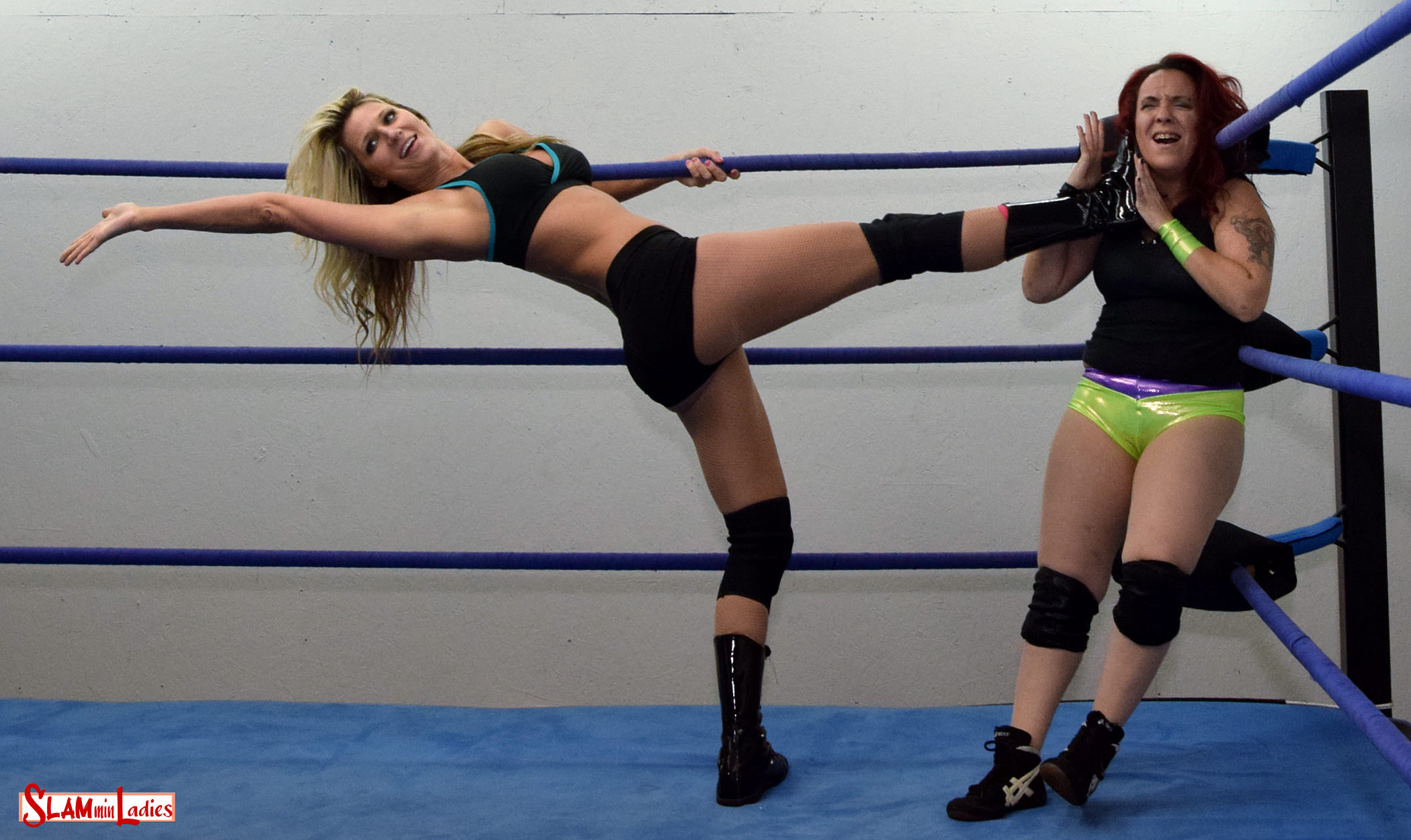 'Supermodel' Amy Love exudes equal parts arrogance and narcissism as she poses with her title belt for her adoring legion of 'Lovelies'. Cherry challenges the champ for her title, but the Supermodel counters with a pose-off. Amy delivers her best catwalk strut making sure it's all about her. Cherry does her best to follow, but gets attacked from behind by the champ who is taking no chances with her title! Amy whips Cherry to the corner and follows up with a series of shoulderblocks to soften up the challenger. Love delivers knee drives to Cherry's spine and Sidewalk Slams but it's Amy's long legs that do the most damage with brutal boot chokes, a Guillotine legdrop, and prolonged headscissors. With Layne thoroughly throttled, Amy delivers a title belt smash to the face before tossing the challenger from the ring to continue her posing for the camera.
