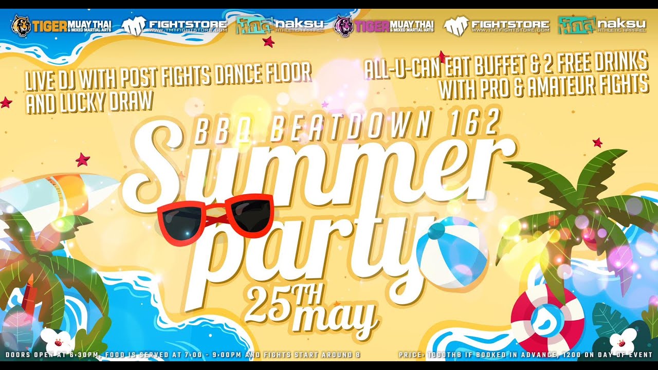 Tiger Muay Thai presents: BBQ Beatdown 162: Summer Party Pro and Amateur Muay Thai, MMA and Boxing Fights LIVE! from the paradise island Phuket, Thailand Train with us: https://www.tigermuaythai.com/online-booking Get TMT gear: https://www.tmtfightstore.com/en/ Subscribe for more training, instructional and fight videos: youtube.com/tigermuaythai?sub_confirmation=1