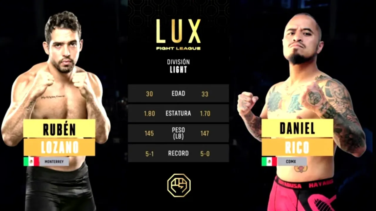 El 2 de febrero de 2018, LUX Fight League presentó su segundo evento oficial: LUX 002, una noche clave en la evolución de las artes marciales mixtas en México. Uno de los enfrentamientos más esperados fue el choque entre Rubén “Diamante” Lozano, conocido por su explosividad y precisión en el striking, y Daniel Rico, un peleador con resistencia, poder físico y mentalidad imparable. Este combate prometía fuego desde el primer segundo, y no decepcionó. Celebrado en un ambiente cargado de adrenalina, Lozano vs. Rico marcó un momento definitorio para ambos atletas, con el público al filo de sus asientos en cada round. Una pelea que no solo consolidó el nivel de la liga, sino que también demostró que el talento nacional está listo para brillar en lo más alto del MMA latinoamericano. --------------------------------------------------------------------------------------------------------------------------- 👉Únete a la comunidad de Lux Fight League: Vive la emoción de la MMA con combates poderosos, análisis profundos y contenido exclusivo: https://luxfightleague.com/ ¡Explora nuestros eventos! ➡️https://luxfightleague.com/eventos/ 📲Mantente Conectado para Más: 📲 Síguenos en las redes sociales 👇 📲 Instagram: https://www.instagram.com/luxfightleague 📲 Facebook: https://www.facebook.com/luxfightleague 📲 Twitter: https://www.twitter.com/luxfightleague 📲 TikTok: https://www.tiktok.com/@luxfightleague 💻 Official Website: https://www.luxfightleague.com