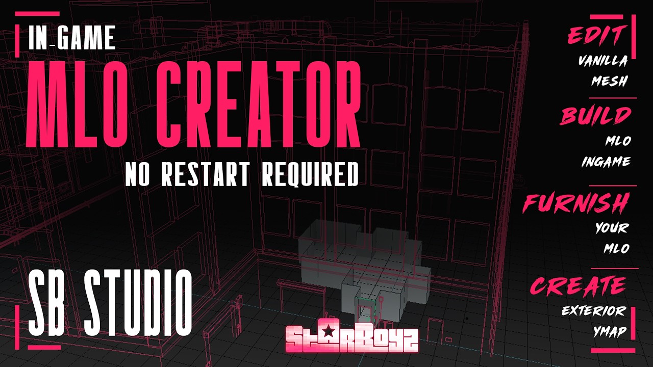 Youtube Preview Guide : https://youtu.be/DufZVfFv6EA Documentation: https://starboys.gitbook.io/starboys-docs Tebex Link : https://starboys.tebex.io/package/7373374 Discord Link: https://discord.gg/Tu3tcvrV4H Description: One hub for everything — SB Studios brings the full map development pipeline inside FiveM, letting you scan and edit vanilla props, build MLO interiors from scratch, create YMAP scenes, and deploy them live without a server restart—no need to juggle external software. 🚀 Features: 🔍 Vanilla Finder & Editor — Scan any map zone to identify Vanilla YDR and collisions instantly, then load, modify, and export geometry with face editing, normal flipping, and real-time collision control. 🏗️ MLO Creator — Build fully custom interiors from scratch using our Grid Editor and 3D modeling tools, with live texturing, UV control, and physics-based collisions—all without using any external software. ✏️ MLO Editor — Load and enhance existing interiors on the fly by spawning props, building addon meshes, creating addon doors, and fine-tuning room atmosphere with per-room timecycle editing. Experience your MLO come to life with our in-game preview mode. 🌍 YMAP Creator — Place vanilla props and build custom exterior scenes with full mesh editing, LOD management, and collision material assignment directly in the open world. 🎨 Built-in Texture Library — Our script comes with 101 seamless textures loaded as a YTD file, which you can use to build your addon meshes. You can also freely add your own textures to the script. 🗄️ Dedicated Database System for YDR & YBN Data — This script uses a dedicated database system to manage the data required for vanilla YDR and YBN files, ensuring a more structured and efficient workflow. 🚀 One-Click Export & Live Streaming — Package and stream YDR, YBN, YTYP, YMAP, and YMF files instantly via SB Studio with zero server restarts at every stage of your workflow.