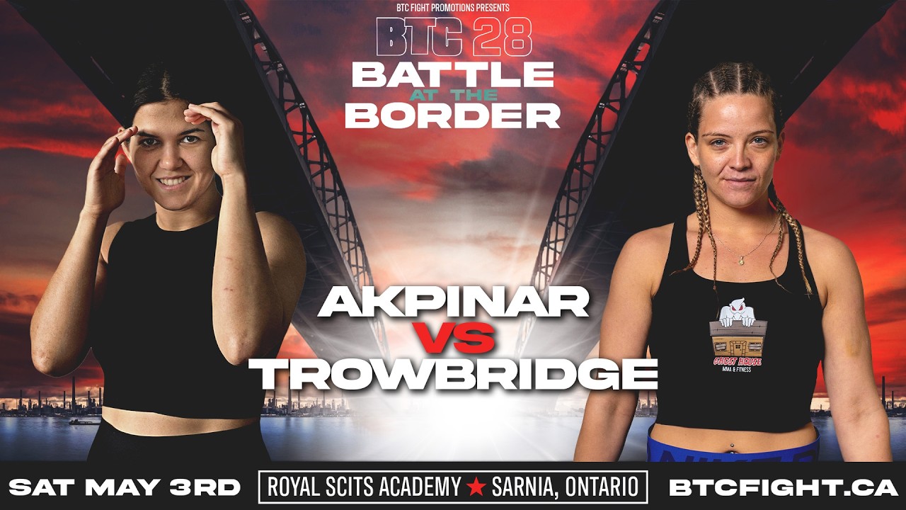 BTC 28: Battle at the Border Gunce Akpinar vs. Robyn Trowbridge Venue: Royal SCITS Academy City: Sarnia, Ontario Date: Sat May 3rd, 2025 Website: https://btcfight.ca Instagram: https://instagram.com/btcfight FaceBook: https://facebook.com/btcfight TikTok: https://tiktok.com/@btcfight Twitter: https://twitter.com/btcfight