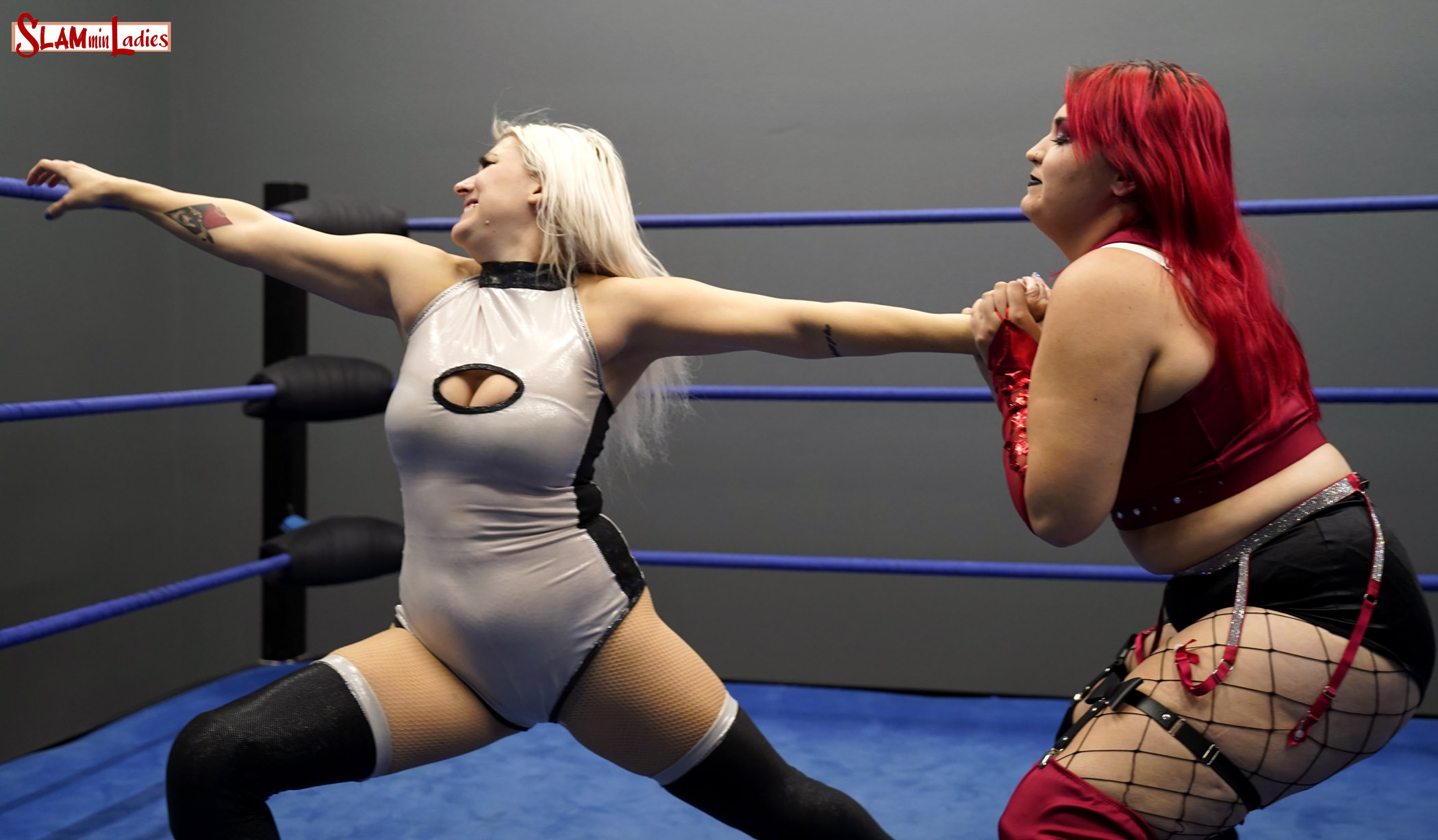 From the canvas to the corners, Heather and Trixie take their turns pounding and overpowering each other in this 1 fall matchup. Heather starts it off with a Hiptoss into a Side Headlock, then Headscissors on the mat. Trixie works her way into a Side Headlock, then gets back to her feet, only to return the favor by Hiptossing Heather to the mat and putting her in a Headscissors. Back on their feet, Heather backs Trixie in the corner, beats on her for a while, then takes her across the ring to drill her face-first into the opposite turnbuckles. Foot chokes, rope chokes and bodyscissors ensue. Trixie responds with a couple anklelocks, but Heather escapes and resumes her attack, with a running splash in the corner, and a running Hip Check to the face against the middle turnbuckle. Trixie begins laughing at Heather’s efforts, then turns the tide with forearm strikes, an Irish Whip into a Clothesline, and a chinbreaker. They continue to trade offense until a submission hold forces a quick tap to end the battle.