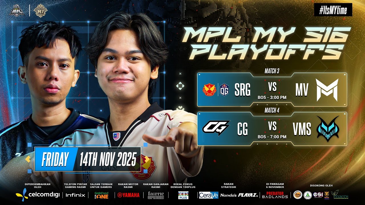 LIVE | [ENG] MPL MY Season 16 Playoffs Day 2 After defeating Homebois, Monster Vicious will be facing the Giants, (SRG.OG) today. Can the Monster take down the Giants or will it be the other way around? Meanwhile, AERO Esports (AERO) will go up against CG Esports (CG) later tonight. Can CG avenge their Regular Season loss, or will AERO crush their hopes of advancing to the Upper Bracket Finals? Friday | 14 November 2025 SRG vs MV | 3:00 PM CG vs VMS | 7:00 PM Get your Playoffs tickets now on the official MPL MY website and stay tuned to MPL MY for all the latest updates 🎟️ #PANTANGMENGALAH #MPLMY #INIGAYAKITA #MPLMYS16 #MLBB #MobileLegendsBangBang
