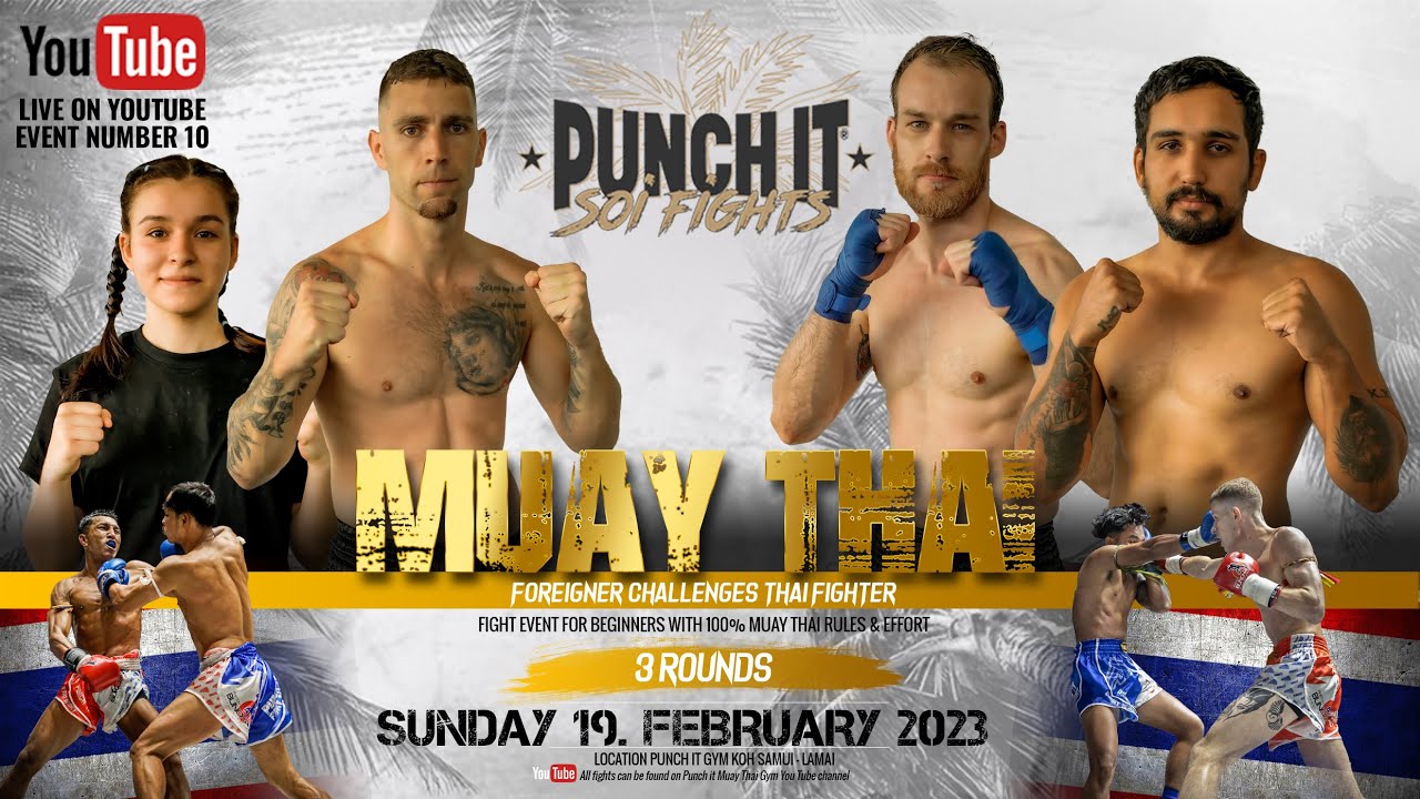 Muay Thai Punch it Soi fight edition #10 on Koh Samui - Thailand, for all 4 participants it is the first fight in Thailand and the preparation for the next fight in the stadium. △CAMP BOOKING You can book the Muay Thai camp on our website https://www.punchitgym.com/accommodation We look forward to your visit and hope to welcome you to Koh Samui soon. LET’S CONNECT US TO #onemuaythaifamily △ Web: https://www.punchitgym.com △ Facebook: https://www.facebook.com/punchitgym △ Instagram: https://www.instagram.com/punch_it_gym_thailand △ TikTok: https://www.tiktok.com/@punchitgym △ Twitter: https://twitter.com/punchitgym △ Web Shop: https://www.punchit.shop