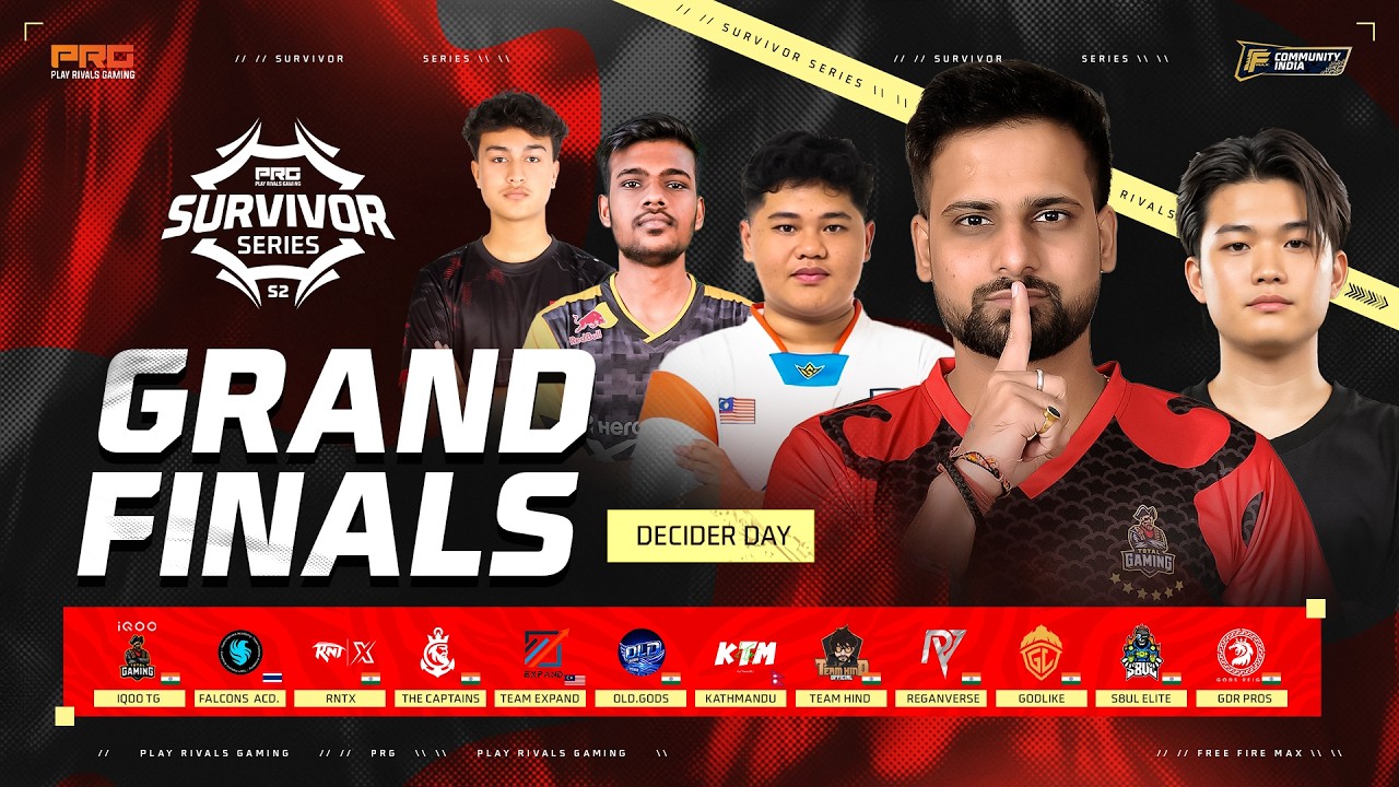 🔥 PRG Survivor Series S2 | Grand Finals DAY 2 - Champion Rush 🔥 Welcome to the official PRG Survivor Series S2 Grand Finals Day 2 livestream! Get ready for intense Free Fire Max action as top squads battle it out for a spot in the next stage of the tournament ⚔️ Stream Details: 🎮 Game: Free Fire Max 📍Tournament: PRG Survivor Series S2 🏆 Stage: Grand Finals (Day 2) 📺 Live Coverage: Official PRG Broadcast 📅 Date: 31/03/2026 (Tuesday) ⏰ Time: 12:00 PM IST 1. IQOO TG 🇮🇳 2. TEAM FALCONS 🇹🇭 3. S8UL ELITE 🇮🇳 4. GODLIKE 🇮🇳 5. GDR PROS 🇮🇳 6. TEAM EXPAND 🇲🇾 7. TEAM HIND 🇮🇳 8. RNTX 🇮🇳 9. KATHMANDU ESPORTS 🇳🇵 ( xDoctor Army) 10. REAGANVERSE 🇮🇳 11. THE CAPTAINS 🇮🇳 12. OLD.GODS 🇮🇳 Good luck Survivors! 💪🏆 Follow @playrivalsgaming on IG for more! #PRGSurvivorSeries #FreeFireMax #GrandFinals #EsportsIndia #LiveEsports #BattleRoyale #GamingLive #tournaments #CompetitiveGaming