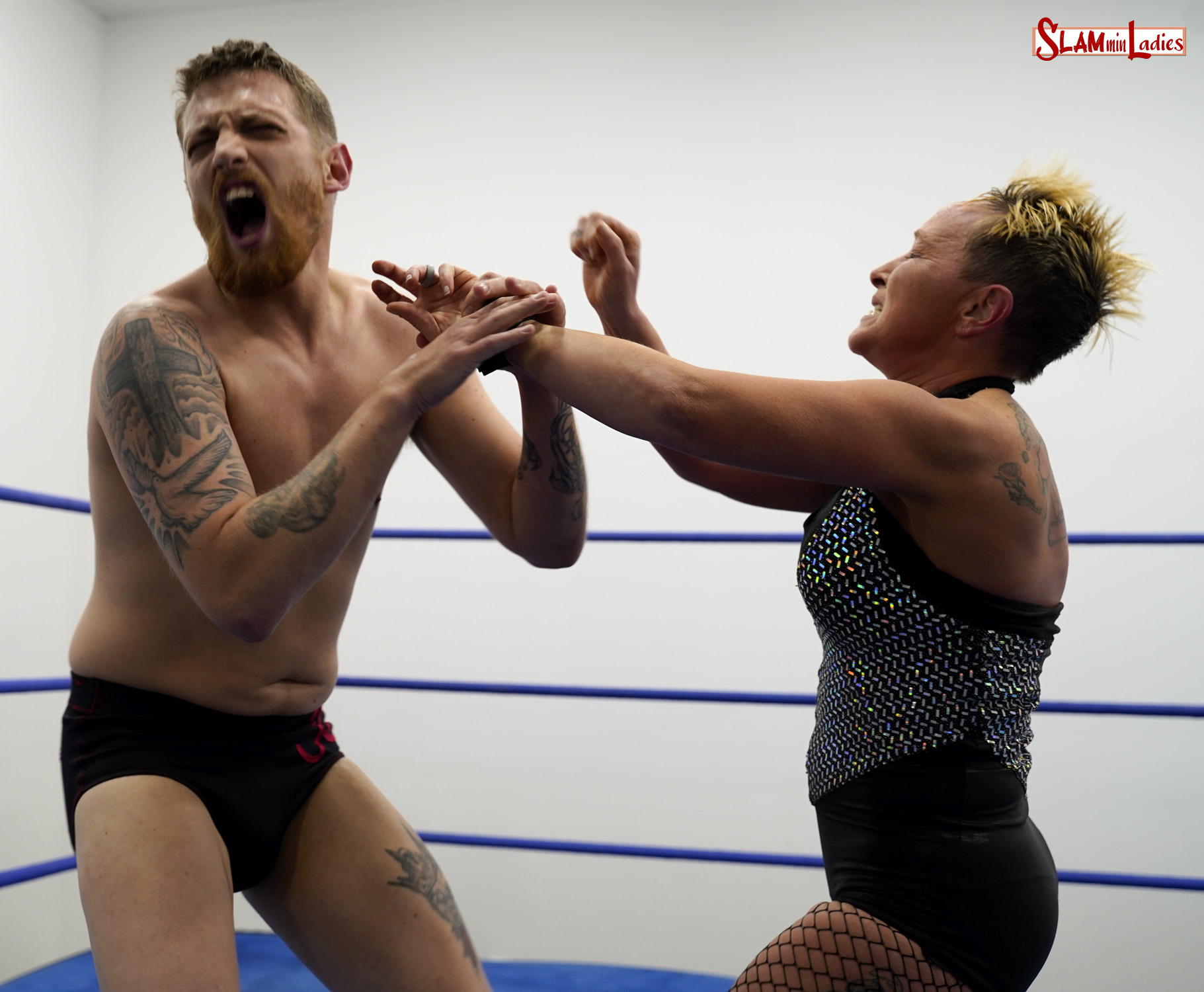 The "toughest broad in wrestling" Randi meets the challenge of "Cutthroat" Jordan Dye. Jordan starts the fight all cocky, but soon finds himself clinging to the bottom rope when Randi takes him down to the mat! West continues the proverbial buttkicking by actually kicking Dye in the butt. Jordan tries to take the fight to Randi, but Randi shows why she earned her nickname, nailing Jordan with a barrage of headbutts and a Clothesline in the corner for a near fall. Jordan hits several jabs on Randi, but West comes back with a shouldertackle, elbow drop, and boot choke among others before hitting her adversary with a devastating second rope Dropkick! To his credit, Jordan manages to kick out at 2. But the toughest broad in wrestling is far from done, saving her most hard-hitting moves for last!