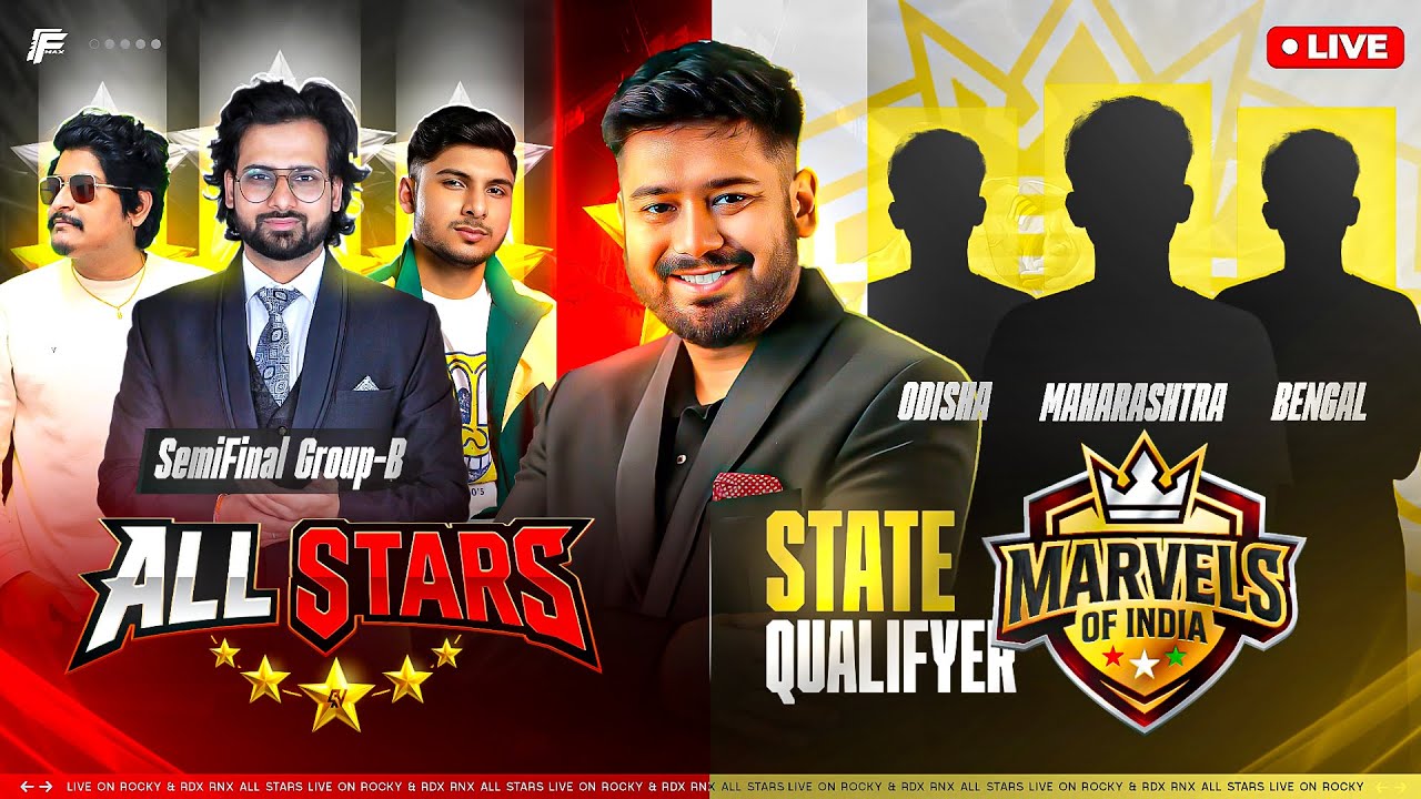 ```ROCKY AND RDX PRESENTS``` *ALL STARS* *Prizepool - 50,000.INR* *SEMI FINALS G-B* *TEAM LIST* iQOO TOTAL GAMING VASIYO ESPORTS NXT GYAN GAMING LAST BREATH IDENTICALS NG PROS RNX ESPORTS JONTY GAMING HN ESPORTS TEAM PAIN `The matches will be Live On ROCKY AND RDX` Best of luck to all teams!