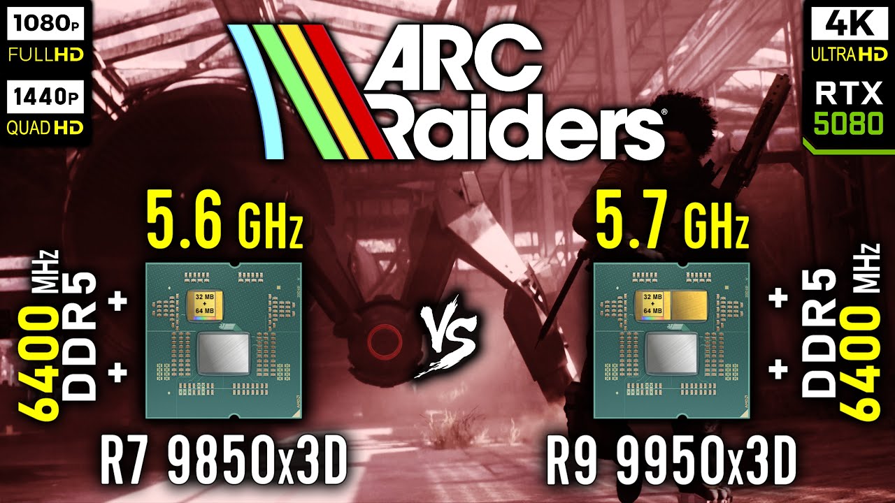 CPU Benchmark AMD Ryzen 7 9850x3D vs Ryzen 9 9950x3D in ARC Raiders (2025) with RTX 5080 - 1080p, 1440p, 2160p 4K 👇👇👇 information Look at what bonuses I offer to sponsors: https://www.youtube.com/channel/UCO346ZpBN8jnD0fsqgF2stA/join Voluntary donations for the channel: https://www.youtube.com/c/NeochannelNeochannel/about Timecode: 00:00 System configuration 00:20 Benchmark - DLSS Ultra perf. - R7 9850x3D vs R9 9950x3D 03:20 Results - DLSS Ultra perf 03:40 Benchmark - Epic | 1080p - R7 9850x3D vs R9 9950x3D 06:40 Results - Epic | 1080p 07:00 Benchmark - Epic | 1440p - R7 9850x3D vs R9 9950x3D 10:00 Results - Epic | 1440p 10:25 Benchmark - Epic | 4K - R7 9850x3D vs R9 9950x3D 13:20 Results - Epic | 4K 13:40 Results R7 9850x3D ( Epic) 1080p vs 1440p vs 4K 13:55 Results R9 9950x3D ( Epic) 1080p vs 1440p vs 4K 14:10 The End System configuration: CPU 1: AMD Ryzen 7 9850x3D (5.6 GHz) CO - disable CPU 2: AMD Ryzen 9 9950x3D (5.5|5.7 GHz) CO -20 MOTHERBOARD: AsRock X870 Pro RS RAM: DDR5 KingBank (2x16 Gb), 6400 MHz [30-37-37-30 CR1] Hynix A-die - SR GPU: GeForce RTX 5080 16Gb (GDDR-7) Palit GameRock NVMe sys: KIOXIA-EXCERIA G2 SSD - 1 Tb [System, SWAP files] NVMe G: GoodRam PX600 SSDPR-PX600-2K0-80 (2 Tb) Game files Cooler: Custom Liquid Cooling (CORSAIR XC7, copper 120x240 mm, SC-600) + Arctic MX-4 Power: Super Flower Leadex Platinum White - 1200W Case: Deepcool Tesseract (open case) Driver: 581.42 ____ #arcraiders #ryzen79850x3d #ryzen99950x3d #r79850x3d #ryzen9850x3d #r99950x3d #ryzen9950x3d #9950x3d #r99900x3d #ryzen99990x3d #ryzen9900x3d #9850x3d #r79800x3d #ryzen79800x3d #ryzen9800x3d #9800x3d #ryzen9000 #amd #x870 #rtx5080 #benchmark #rtx5070ti #rtx4080 #1080p #1080p60fps #1440p #2160p #4k #arcraiders #arc #raiders #arcraidersgameplay #arcraiderspc #neochannel #neochannelbenchmark
