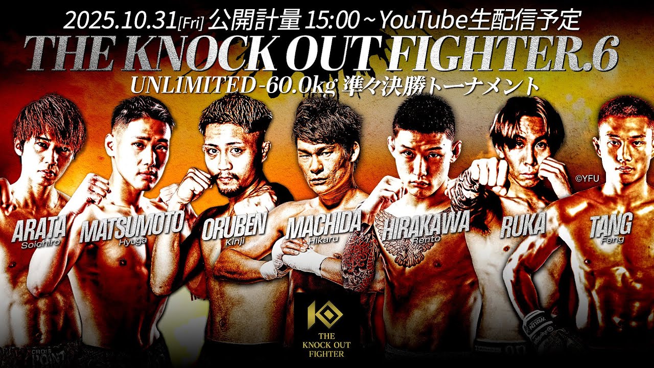 2025年11月1日(土)にKNOCK OUT常葉アリーナで行われる 「THE KNOCK OUT FIGHTER.6」の前日公開計量をYouTubeにて生配信いたします。 日時:2025年10月31日(金) 15:00 配信開始(予定)是非ご視聴ください。 ー第9試合ー THE KNOCK OUT FIGHTER UNLIMITED-60.0kgトーナメント準々決勝 第3試合/3分3R 平川蓮斗(和術慧⾈會 HEARTS) HIRAKAWA Rento VS オルベン・キンジ(K-PLACE) ORUBEN Kinji ー第8試合ー THE KNOCK OUT FIGHTER UNLIMITED-60.0kgトーナメント準々決勝 第2試合/3分3R 松本飛雅(パラエストラ広島) MATSUMOTO Hyuga VS 新田宗一朗(KNOCK OUTクロスポイント吉祥寺) ARATA Soichiro ー第7試合ー THE KNOCK OUT FIGHTER UNLIMITED-60.0kgトーナメント準々決勝 第1試合/3分3R 瑠夏(フリー) RUKA VS タン・フォン(中国/長沙鋭景ファイティングクラブ/CFP)TANG Feng THE KNOCK OUT FIGHTER ー第6試合ー KNOCK OUT-UNLIMITED-68.0kg契約/3分3R 石田協(K-1 GYM SAGAMI-ONO KREST) ISHIDA Kano VS 梅津ガブリエル(K-PLACE) UMETSU Gabriel ー第5試合ー KNOCK OUT-UNLIMITEDスーパーライト級/3分3R 木村亮彦(KNOCK OUTクロスポイント大泉) KIMURA Akihiro VS 羽村りょうたろう(CANDY GYM) HAMURA Ryotaro ー第4試合ー KNOCK OUT-UNLIMITED-63.0kg契約/2分3R 中村悠磨(和術慧⾈會 HEARTS) NAKAMURA Yuma VS 三浦健人(パラエストラ広島) MIURA Kento ー第3試合ー KNOCK OUT-BLACKスーパーフェザー級/3分3R・延長1R 河崎鎧輝(真樹ジムオキナワ) KAWASAKI Kaiki VS MAKURI (フリー) MAKURI ー第2試合ー KNOCK OUTアマチュアUNLIMITED-57.0kg/2分3R 安達優心(BRAVE FIGHT CLUB) ADACHI Yushin VS 岡田悠希(KNOCK OUT クロスポイント吉祥寺) OKADA Yuki ー第1試合ー KNOCK OUTアマチュアUNLIMITED-58.0kg/2分3R 長谷川柊哉(和術慧⾈會 HEARTS/ AXGYM) HASEGAWA Shuya VS 石渡寛崇(Fired Up Gym) ISHIWATA Hirotaka 予定しておりました THE KNOCK OUT FIGHTER UNLIMITED-60.0kgトーナメント準々決勝 第4試合は 試合中止が決定しております。