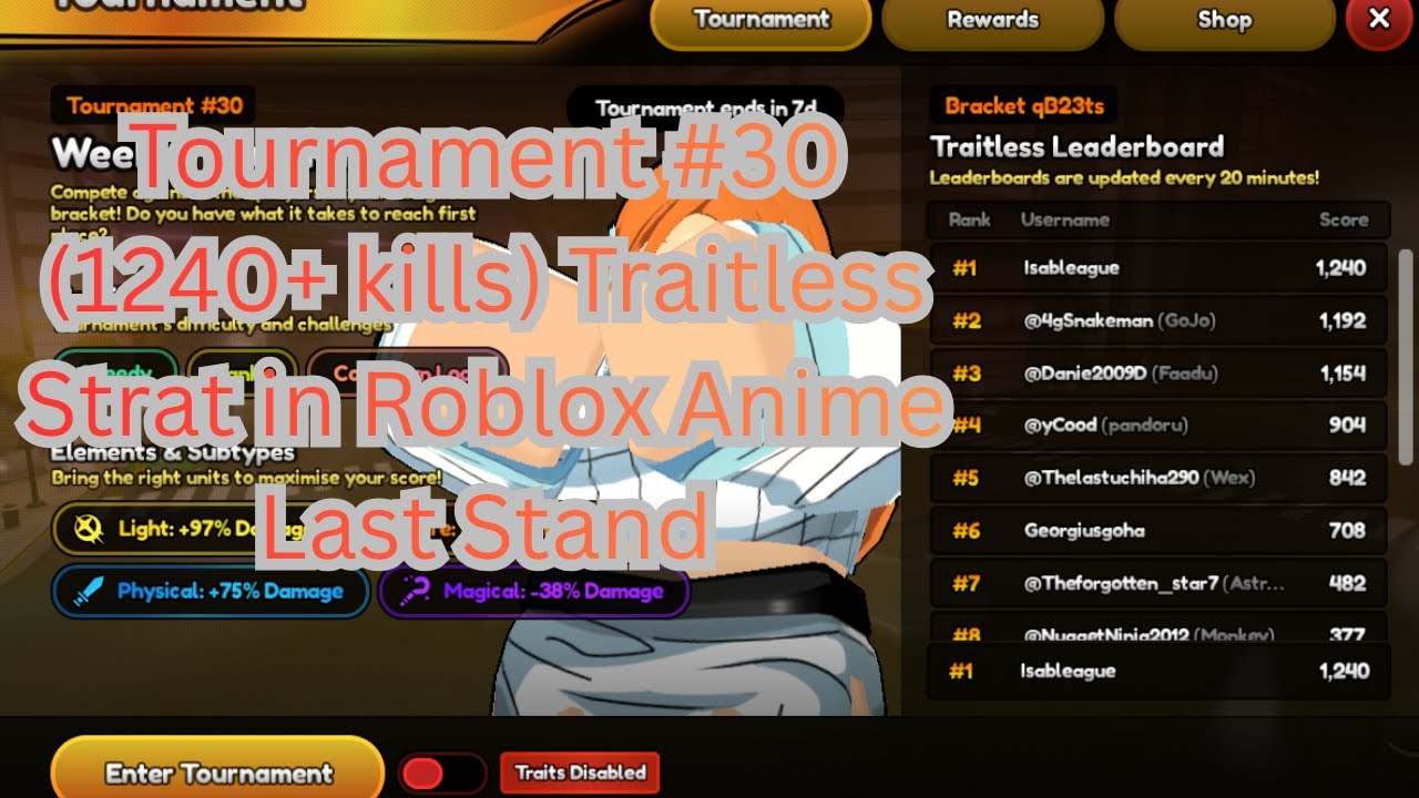 Tournament #30 (1240+ kills) Traitless Strat in Roblox Anime Last Stand